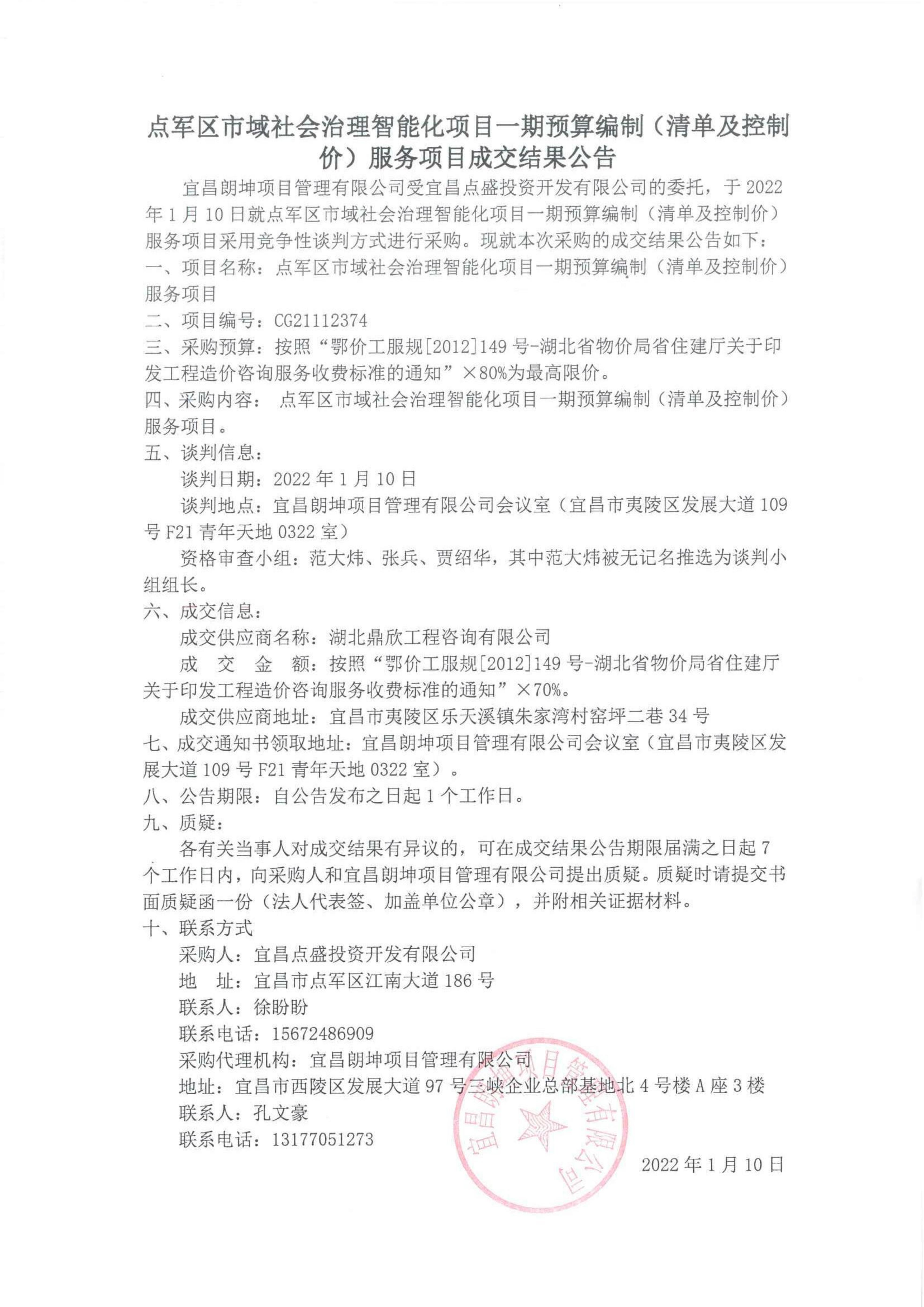 點(diǎn)軍區(qū)市域社會(huì)治理智能化項(xiàng)目一期預(yù)算編制(清單及控制價(jià))服務(wù)項(xiàng)目成交結(jié)果公告