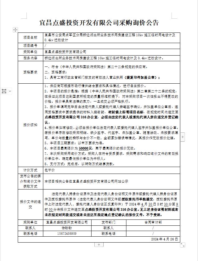 宜昌市公安局點(diǎn)軍區(qū)分局橋邊派出所業(yè)務(wù)技術(shù)用房建設(shè)工程10kv施工臨時(shí)用電設(shè)計(jì)及0.4kv遷改設(shè)計(jì)詢(xún)價(jià)公告