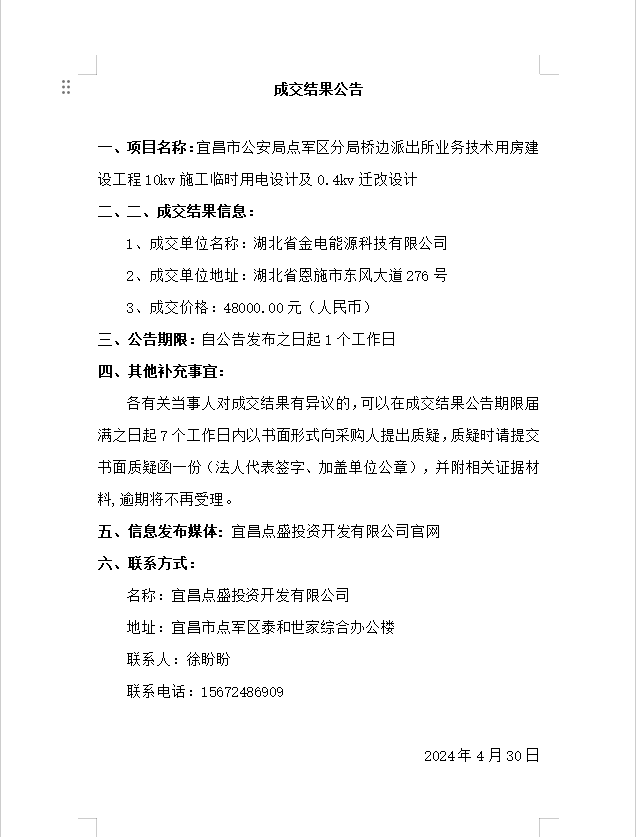 宜昌市公安局點(diǎn)軍區(qū)分局橋邊派出所業(yè)務(wù)技術(shù)用房建設(shè)工程10kv施工臨時用電設(shè)計(jì)及0.4kv遷改設(shè)計(jì)成交公告