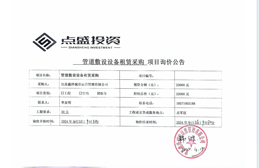 宜昌鑫澤城市運(yùn)營(yíng)管理有限公司管道敷設(shè)設(shè)備租賃采購項(xiàng)目詢價(jià)公告