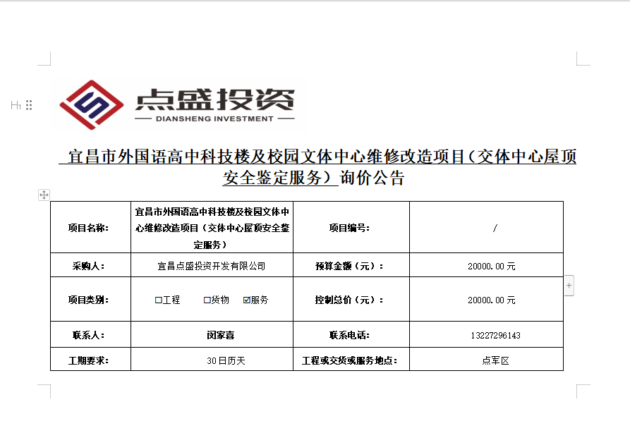 宜昌市外國(guó)語(yǔ)高中科技樓及校園文體中心維修改造項(xiàng)目(交體中心屋頂安全鑒定服務(wù))詢價(jià)公告