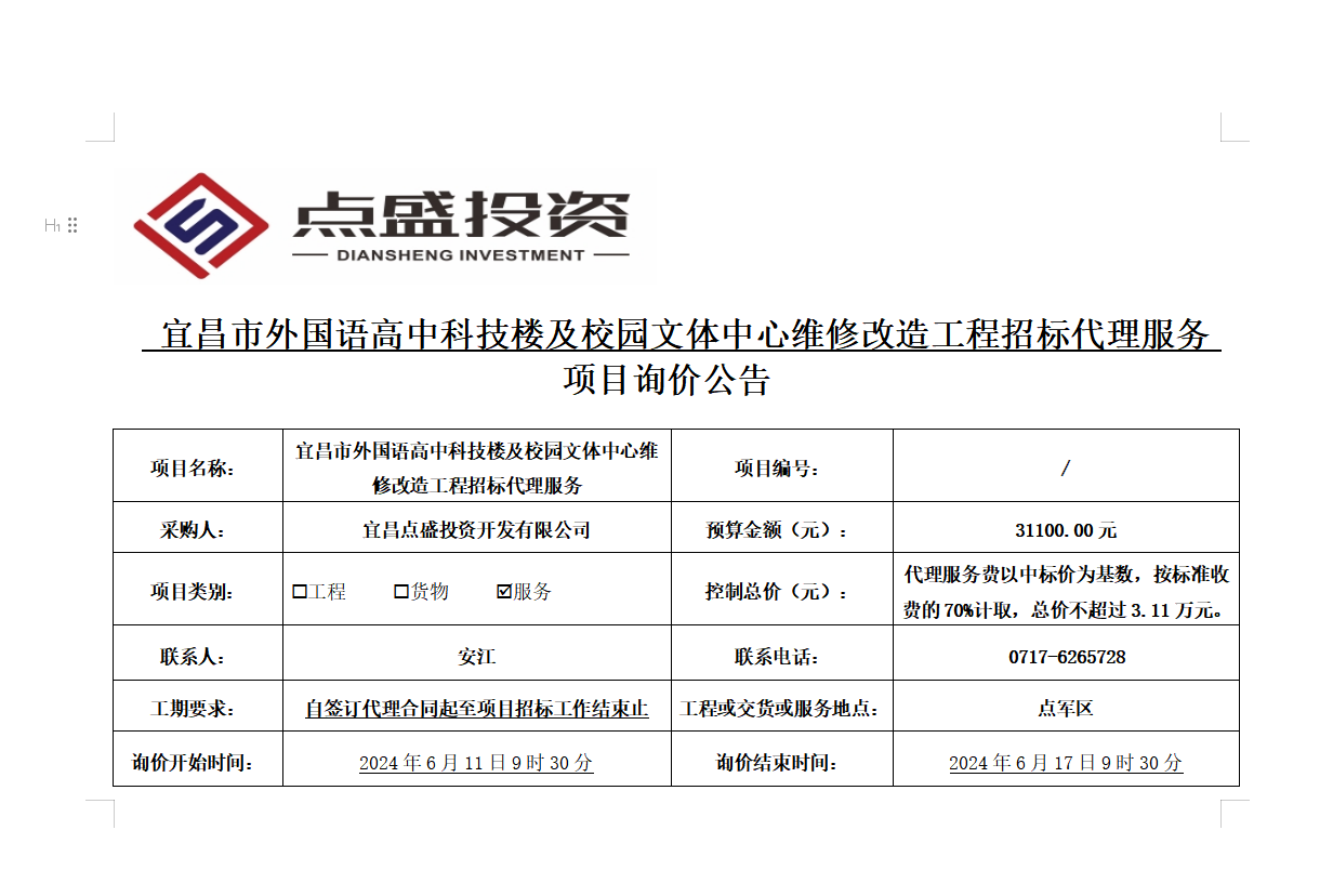 宜昌市外國語高中科技樓及校園文體中心維修改造工程招標(biāo)代理詢價(jià)公告