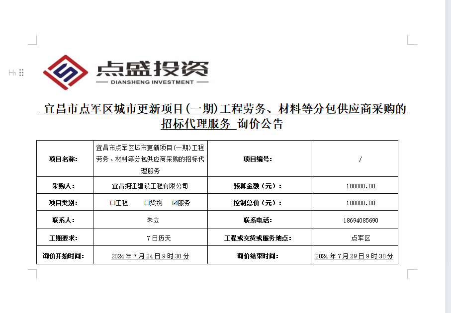 宜昌市點軍區(qū)城市更新項目(一期)工程勞務、材料等分包供應商采購的招標代理服務詢價公告