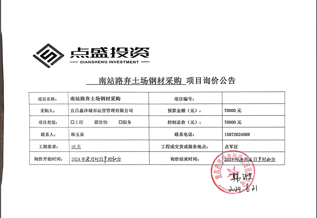 南站路棄土場(chǎng)鋼材采購(gòu)項(xiàng)目詢價(jià)公告