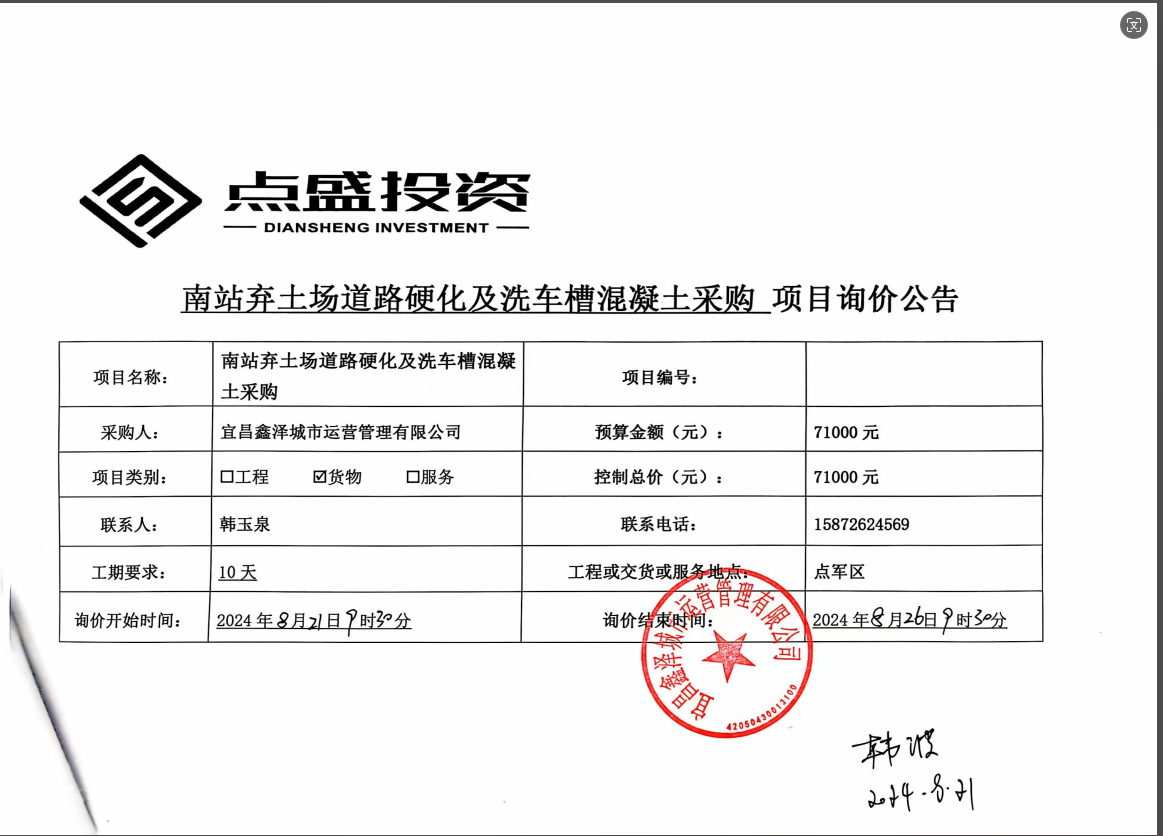 宜昌鑫澤城市運營管理有限公司南站棄土場道路硬化及洗車槽混凝土采購項目詢價公告
