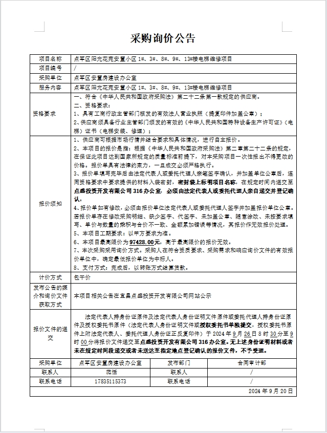 點(diǎn)軍區(qū)陽光花苑安置小區(qū)1#、3#、8#、9#、13#樓電梯維修項(xiàng)目詢價(jià)公告