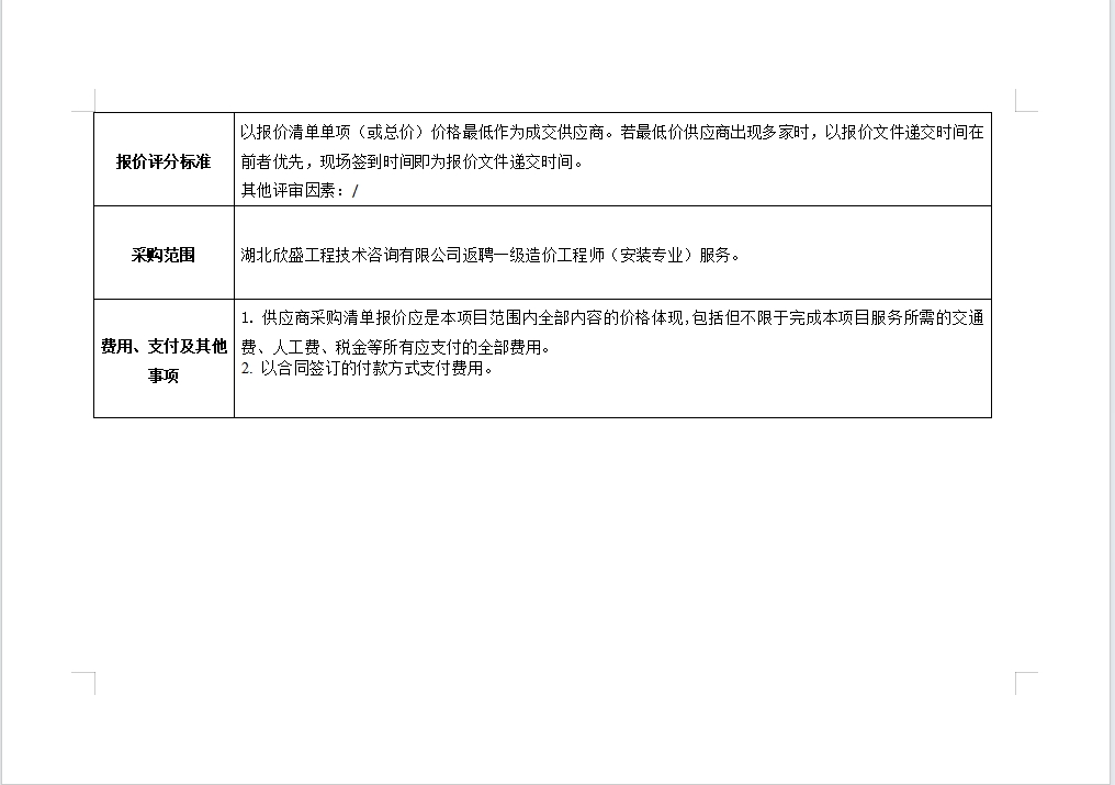 欣盛公司返聘一級造價(jià)工程師(安裝專業(yè))咨詢服務(wù)詢價(jià)公告