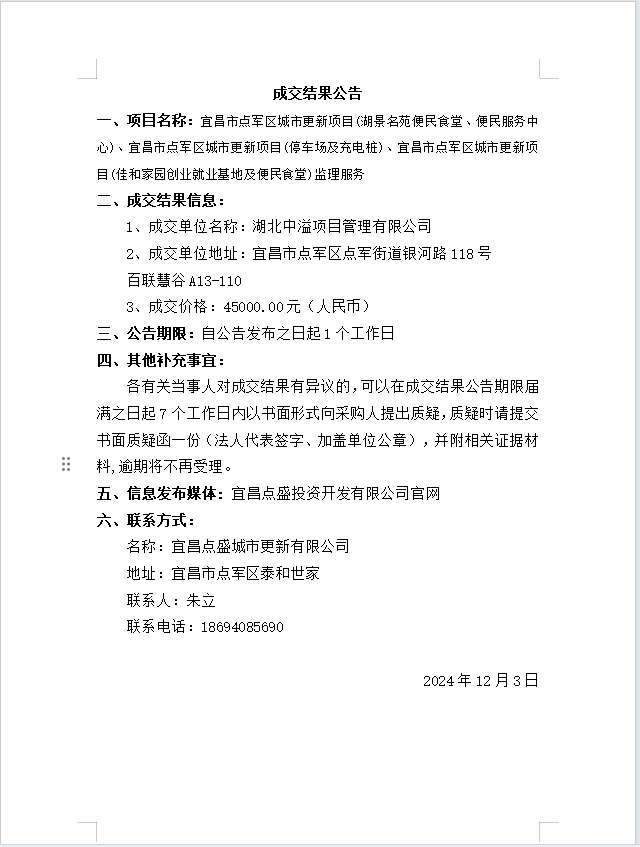 宜昌市點(diǎn)軍區(qū)城市更新項(xiàng)目(湖景名苑便民食堂、便民服務(wù)中心)、宜昌市點(diǎn)軍區(qū)城市更新項(xiàng)目(停車場及充電樁)、宜昌市點(diǎn)軍區(qū)城市更新項(xiàng)目(佳和家園創(chuàng)業(yè)就業(yè)基地及便民食堂)監(jiān)理服務(wù)成交公告